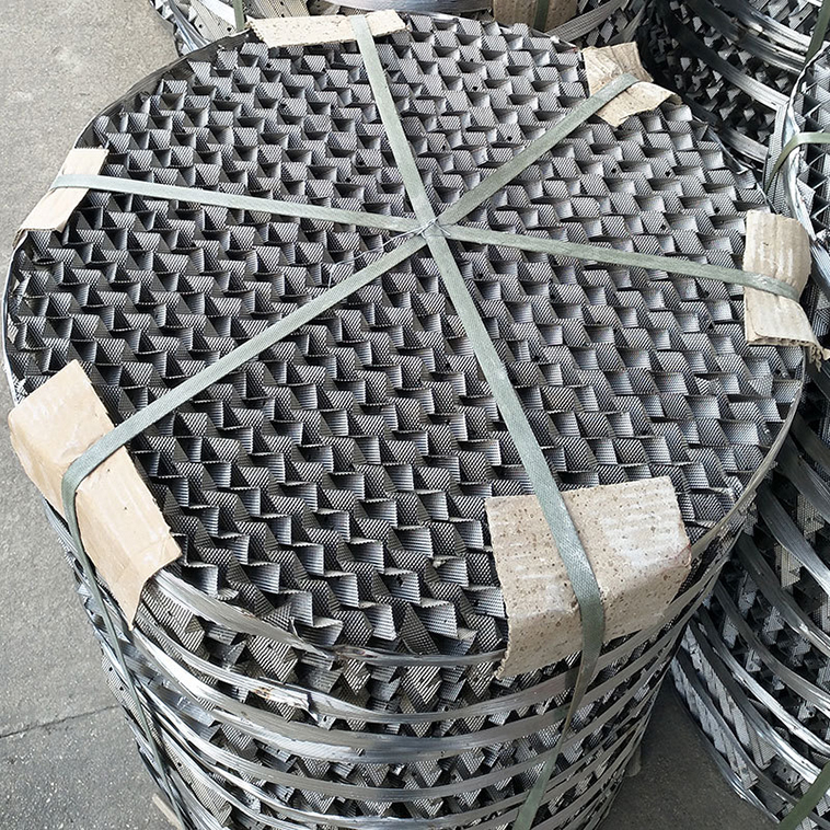 防辟流圈一般與填料一體每塊填料安裝前務(wù)必將防壁流恩按前述要求打開。通常安安由一端開始至另一端結(jié)束第()一盤填料波紋片方向與支承板方向成45角,相鄰兩盤填米波紋成90角每盤填料安裝的起始位置,每四盤填料為一個周期,這樣成順時針(或逆時針)方向轉(zhuǎn)動組裝填料盤,這樣可以縮小填料上端面水平誤差。絲網(wǎng)填料每盤安裝完畢后再去掉句角。+